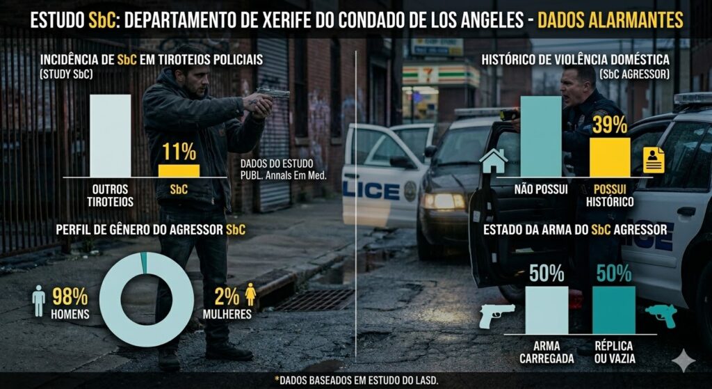 Muitas vezes, olhamos para as ocorrências e focamos apenas na balística e no resultado tático. Mas o estudo publicado no Annals of Emergency Medicine, analisando dados do Departamento de Xerife do Condado de Los Angeles, revelou uma realidade alarmante: 11% dos tiroteios envolvendo policiais se encaixam no perfil de SbC.