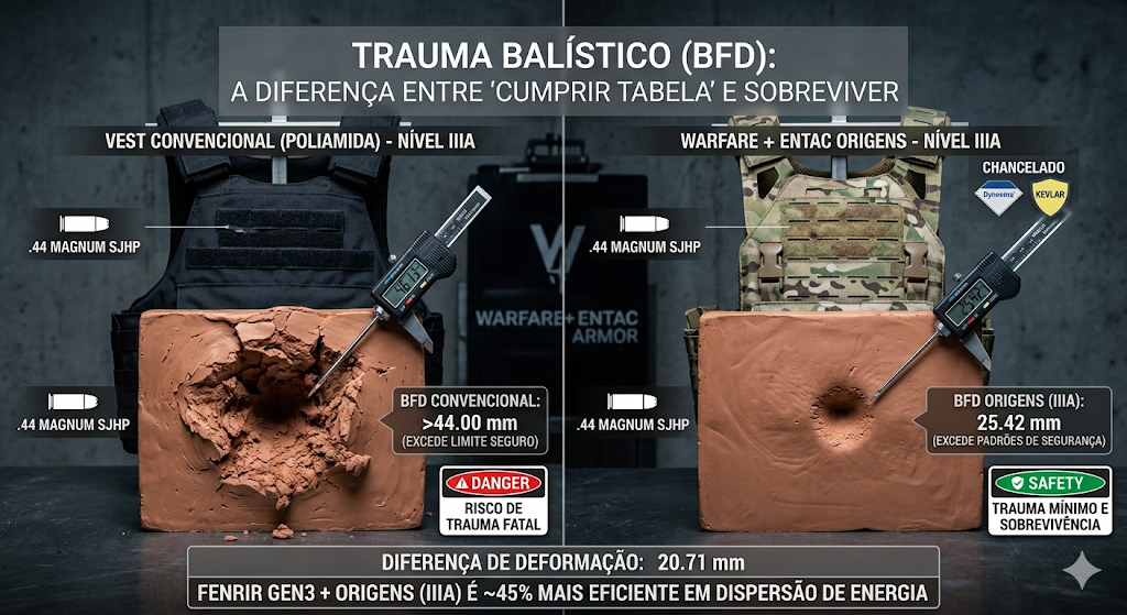 Um ponto crucial que o operador comum ignora, mas que a Warfare e a Entac fazem questão de expor, é o V50. Enquanto o teste V0 garante que o colete segura a munição na velocidade padrão, o V50 busca o limite de ruptura do material.